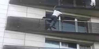 Muškarac je snimljen kako se penje na jednu parišku zgradu kako bi spasio četverogodišnje dijete koje je visilo s blakona.